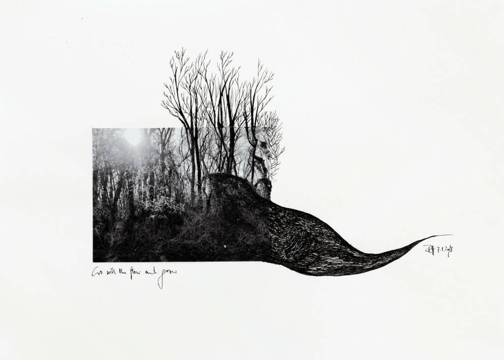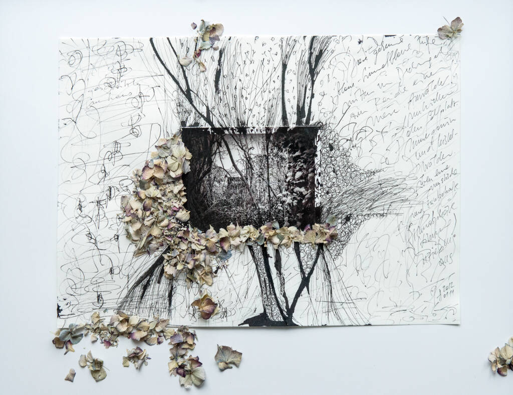 medium: mixed media of pigment print on Hahnemuehle PhotoRag Ultra Smooth, ink, found objects (blossoms)