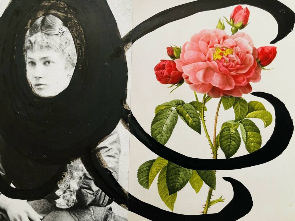 Stella Bach rosa centifolia bullata, 2013 collage on wood, overpainted with ink, 25 x 18 cm