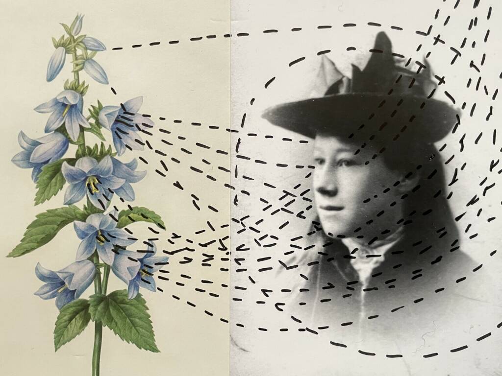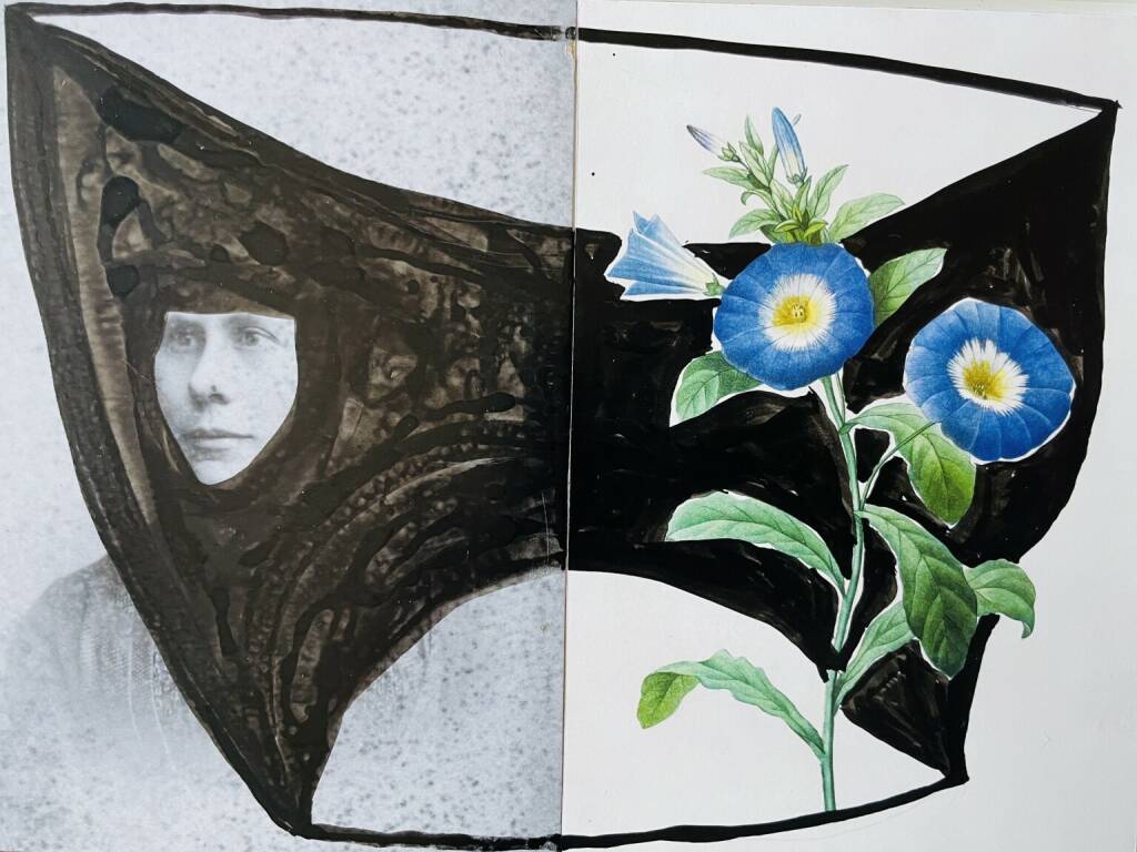 Stella Bach iris sibirica, 2018 collage on wood, overpainted with ink, 25 x 18 cm