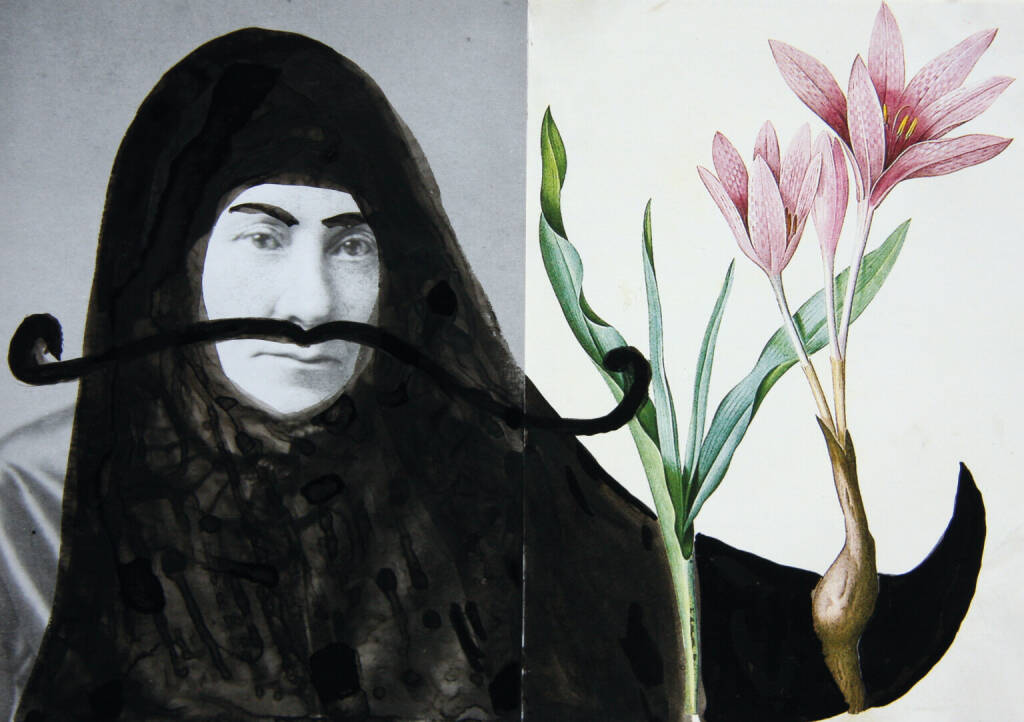 Stella Bach gladiolus comunis, 2018 collage on wood, overpainted with ink, 25 x 18 cm
