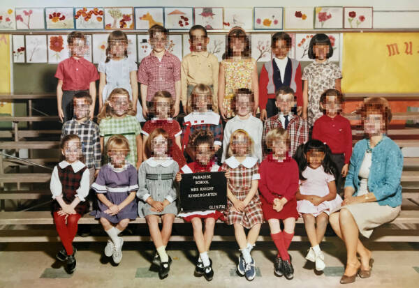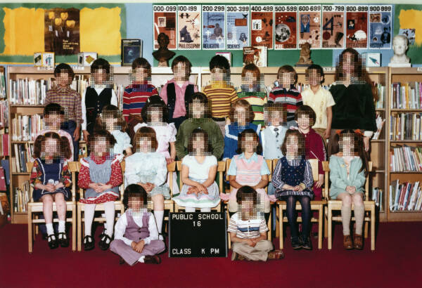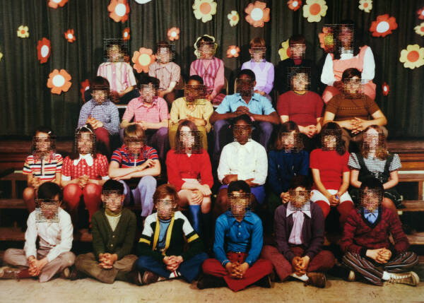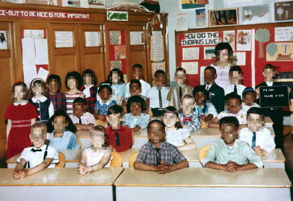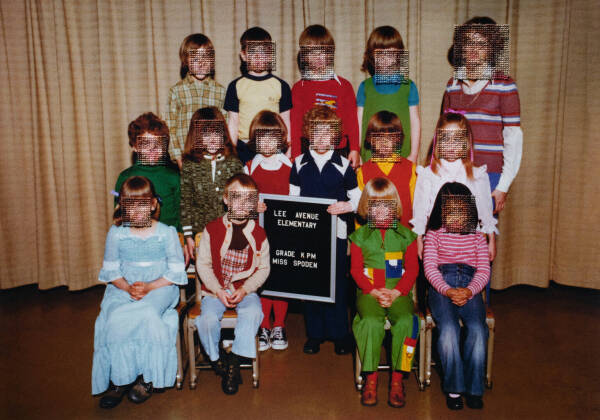 I have been working on an on-going series of hand-embroidered photographs based on found elementary school class pictures from the 1970s. The class photos are from big cities and small towns throughout the United States but, despite their varied locations, the poses of children and teachers, classroom decorations, and clothing are strikingly similar providing a glimpse into the zeitgeist of the this generation and a view into education systems of the time. In the class photographs, the faces of the students, or what would normally be the main focal points of the image, are obscured with cross-stitch embroidery made to resemble the digital pixel structure of the image and sewn directly into the photograph. By obscuring what would typically be the most important parts of the image, otherwise overlooked details are brought into focus such as body language, other embodiments of social convention and the relationship between the various figures. I am interested in this time period not only because it is my own generation, but because it is the last generation to have a childhood unclouded by digital technology. These class pictures were taken before camera phones and digital cameras and at a time when having one’s class picture taken was a more formal occasion- something that has been lost due to the ubiquitous nature of digital photography- making participants more conscious of the photograph as an aspirational vehicle for impression management.
