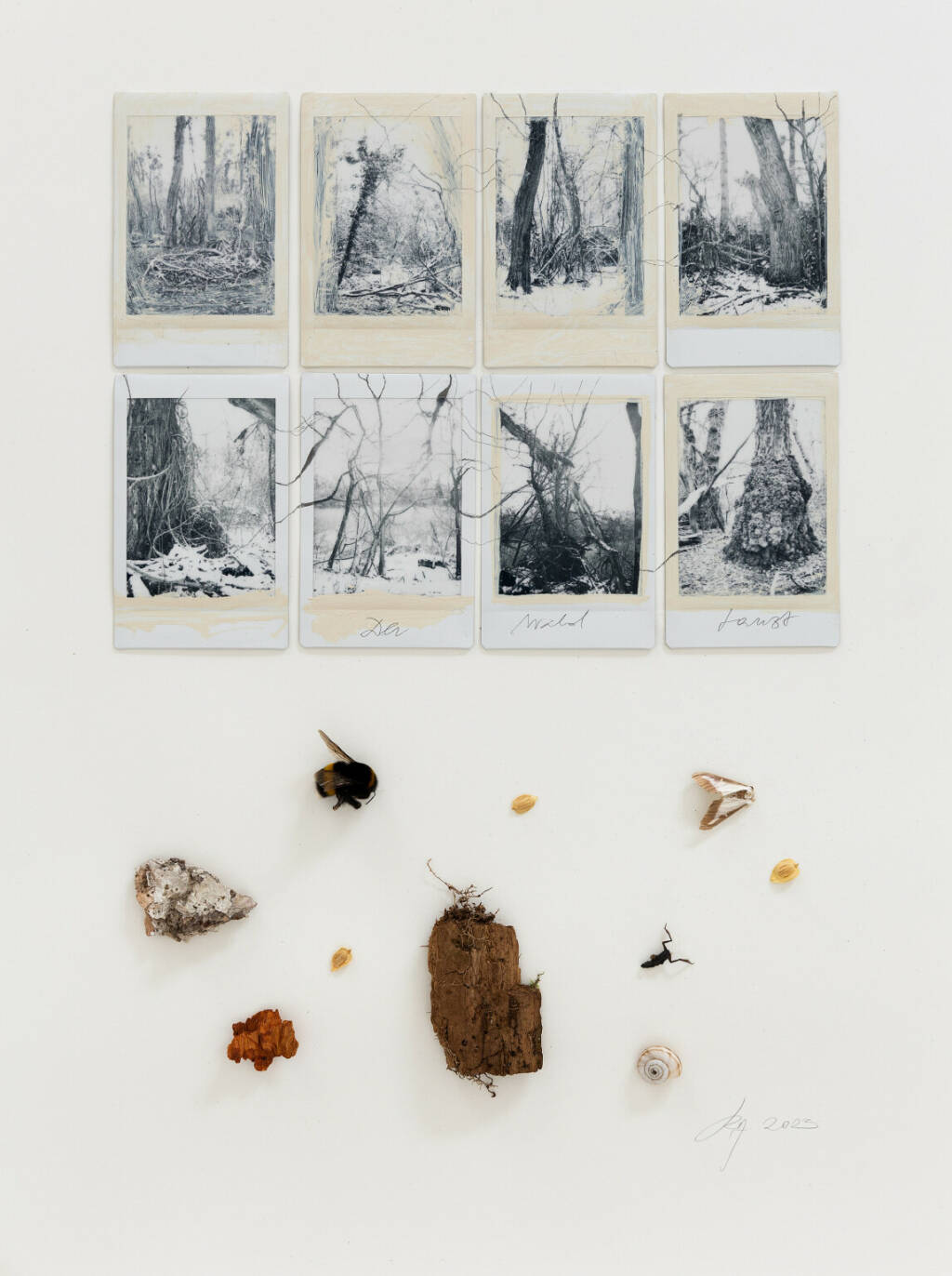 Regina Anzenberger Roots & Waltz (Native Grounds) II, 2023 mixed media, instant photograph, acrylic, pencil, found objects, 30 x 30 cm