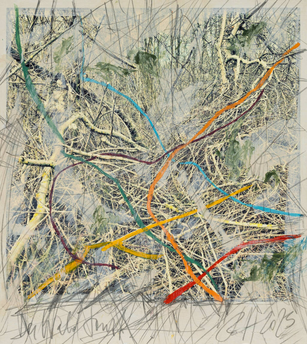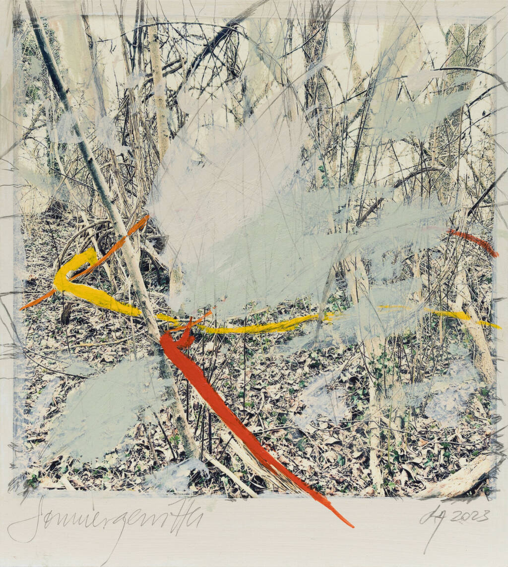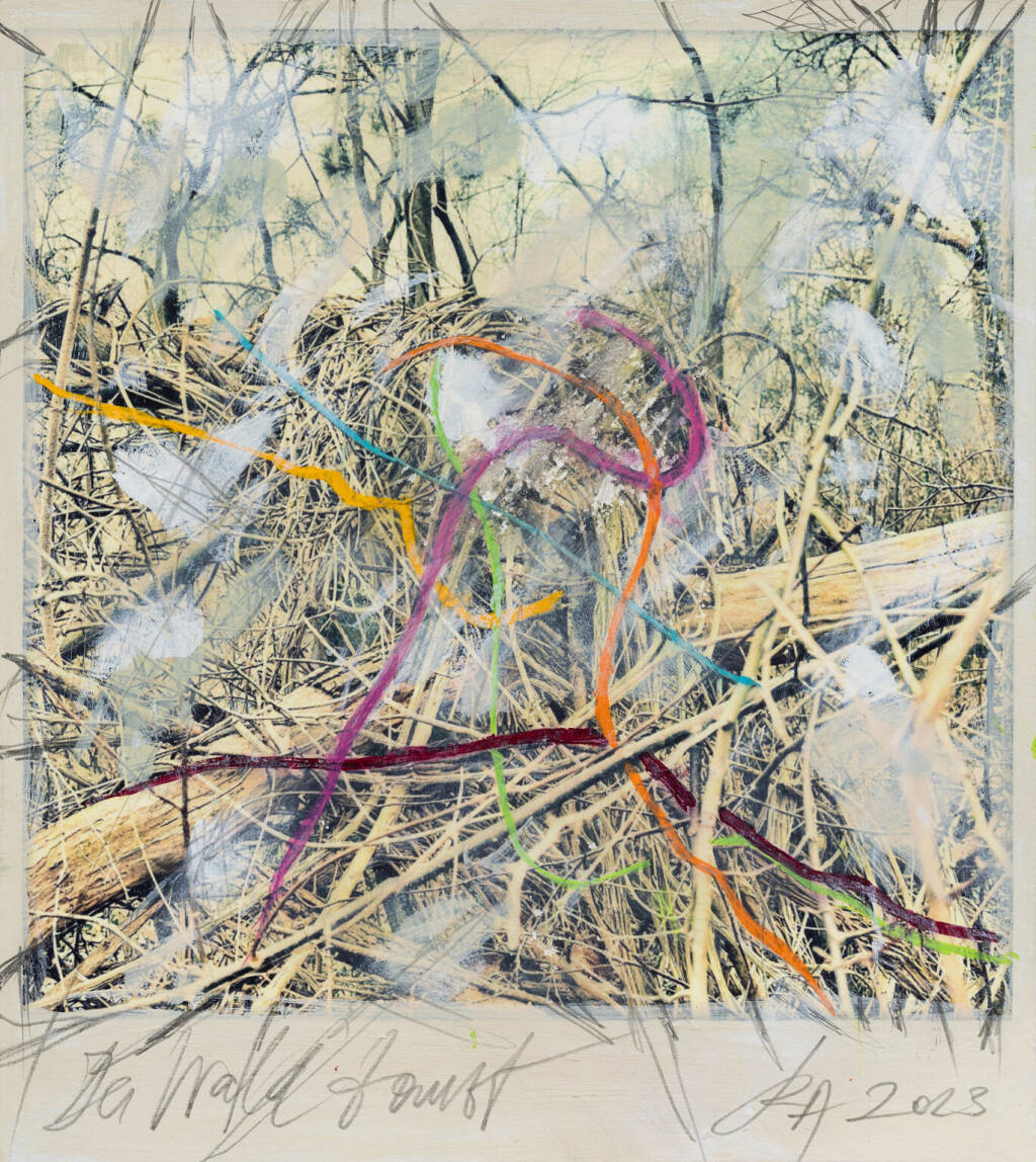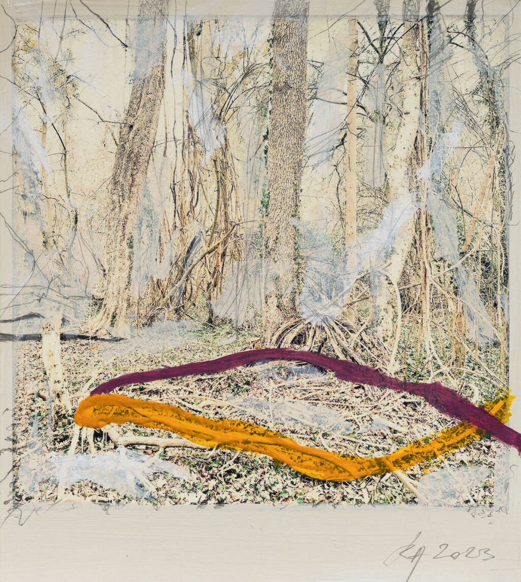 Regina Anzenberger Roots & Waltz sf series 16, 2023 pigment print on Hahnemuehle PhotoRag Ultra Smooth, acrylic, pencil, 20 x 20 cm