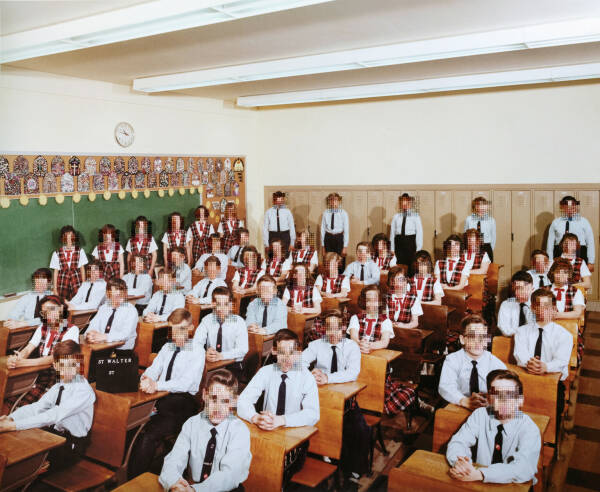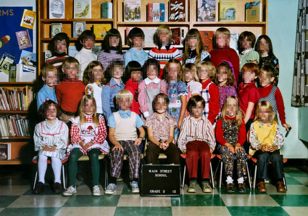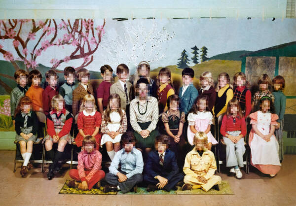 I have been working on an on-going series of hand-embroidered photographs based on found elementary school class pictures from the 1970s. The class photos are from big cities and small towns throughout the United States but, despite their varied locations, the poses of children and teachers, classroom decorations, and clothing are strikingly similar providing a glimpse into the zeitgeist of the this generation and a view into education systems of the time. In the class photographs, the faces of the students, or what would normally be the main focal points of the image, are obscured with cross-stitch embroidery made to resemble the digital pixel structure of the image and sewn directly into the photograph. By obscuring what would typically be the most important parts of the image, otherwise overlooked details are brought into focus such as body language, other embodiments of social convention and the relationship between the various figures. I am interested in this time period not only because it is my own generation, but because it is the last generation to have a childhood unclouded by digital technology. These class pictures were taken before camera phones and digital cameras and at a time when having one’s class picture taken was a more formal occasion- something that has been lost due to the ubiquitous nature of digital photography- making participants more conscious of the photograph as an aspirational vehicle for impression management.